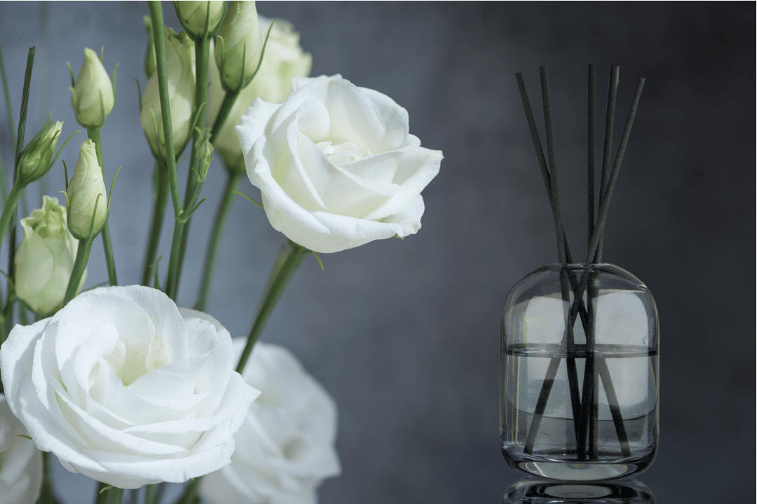 "Imagine a sleek vessel, filled with a fragrant elixir, crowned with slender reeds that reach for the sky like botanical antennae, quietly drawing in the fragrance and casting it forth into your living space."