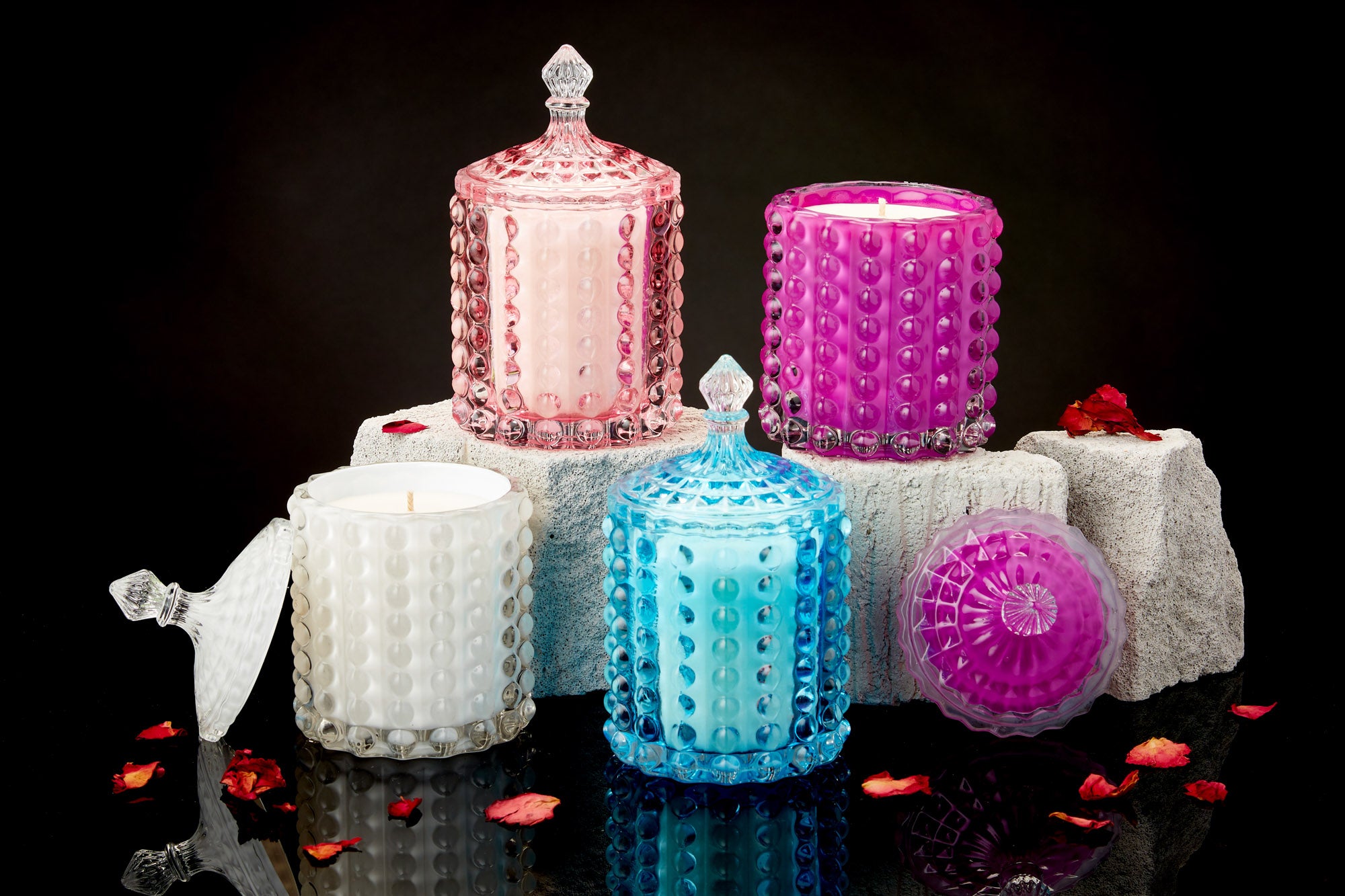 Our scented candle handcrafted in Freya, a wonderful tactile piece of glassware, embossed with bubbles and topped with an exquisite glass lid. Available in 4 elegant colours.